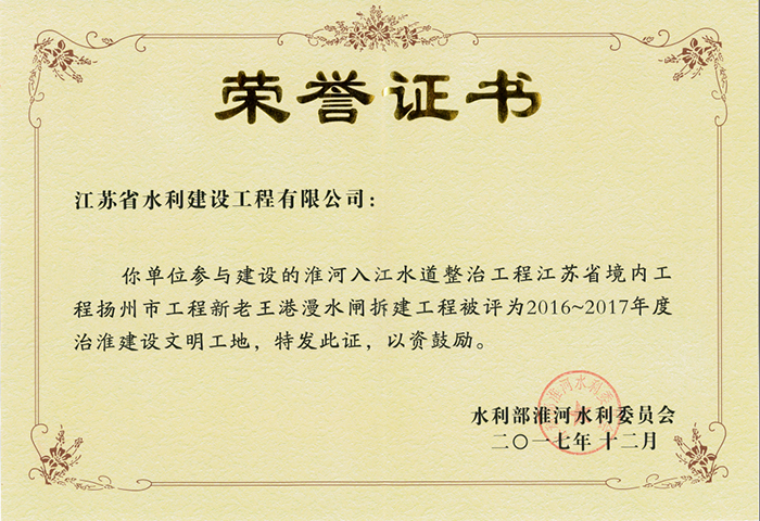 公司连续多年被评为全国水利建设先进集体、全国优秀水利企业、全国安全生产和质量管理先进单位、江苏省文明单位、建筑业百强企业,荣获江苏省“五一劳动奖章”。