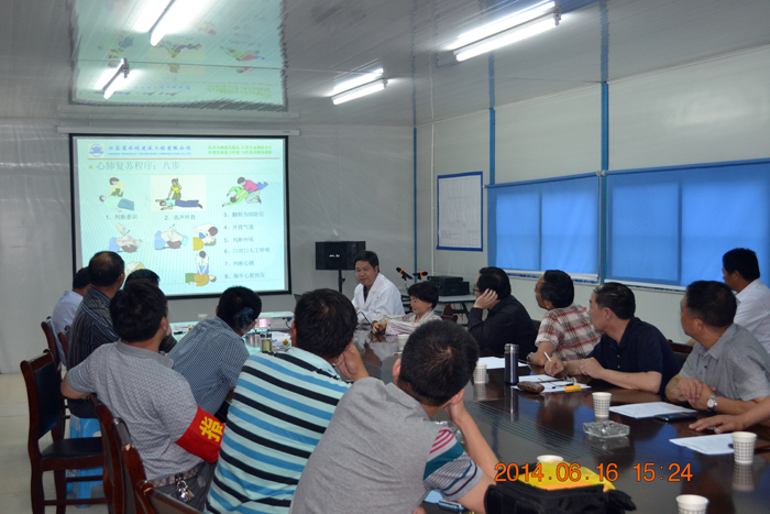 演练开始前,在项目部会议室进行了应急救援知识的培训。分公司安全科长朱跃南向参演人员讲述了溺水救护的有关知识,然后由具备职业资格的主治医师刘东从专业角度讲解了如何进行抢救和救治落水者。