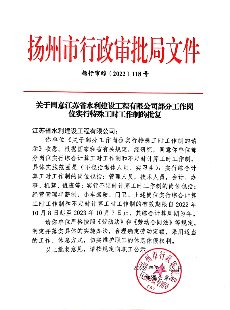 关于同意江苏省水利建设工程有限公司部分工作岗位实行特殊工时工作制的批复文件